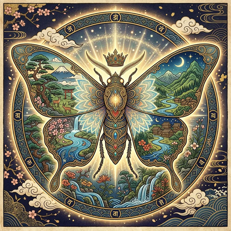 Imagine a symbol inspired by the mythical concept of a giant moth. The design is intricate and ornate, resembling traditional Japanese artworks, filled with detailed wing patterns that seem to radiate light, emphasizing the deity-like presence this creature possesses in legends. Within the wings, symbols of nature like trees and rivers further emphasize its alleged role as a protector of the environment. A soft glow surrounds the emblem, reinforcing its mystical aura.