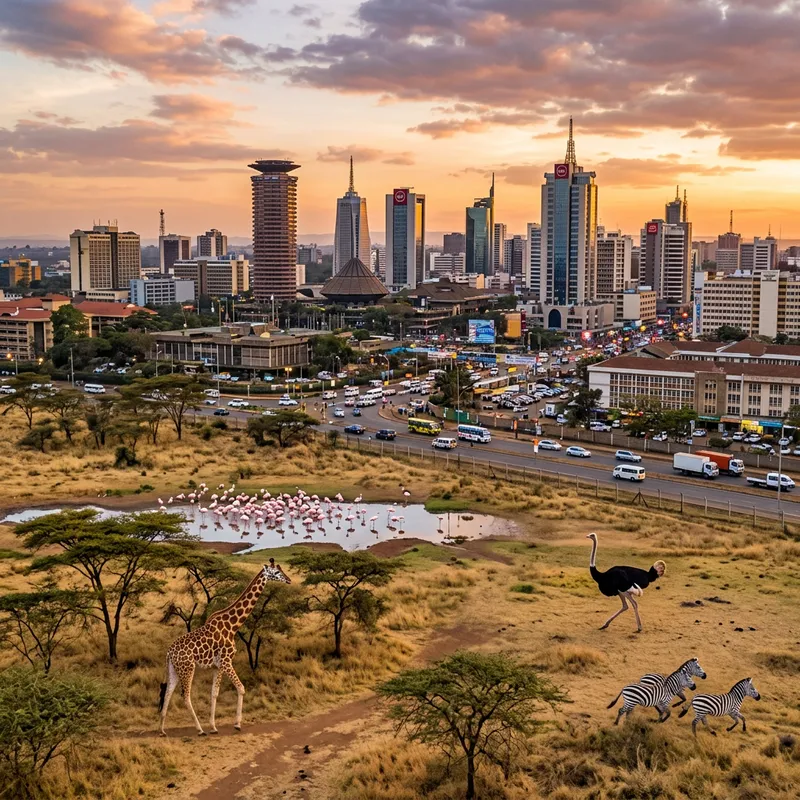 A scenic view of Nairobi city, showcasing its unique intersection of urban development and wildlife preservation. In the centre, we see a busy, bustling cityscape with high-rise buildings, intricately designed architecture, and vibrant streets with vehicles of various kinds. On the outskirts, the city gently transitions into untouched natural landscapes, where a diverse collection of wildlife roam freely. An agile giraffe can be seen gracefully walking near some acacia trees, a tall ostrich struts proudly across an open field, a zebra gallops playfully, and a group of flamingos make a colourful splash near a body of water. The clear sky overhead during a graceful sunset, the city skyline to one side and the wild landscapes on the other, create a fascinating balance unlike any other.