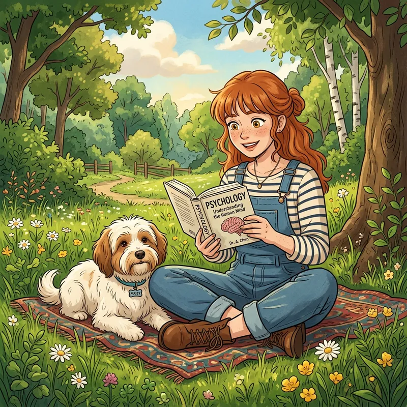 Create an animation-style illustration depicting a nature-loving redhead woman with freckles, bangs, honey-colored eyes, sitting in the grass. She's engrossed in a book about psychology, wearing a denim overalls. By her side, rests her loyal female Tibetan Terrier with a white coat and light brown face.