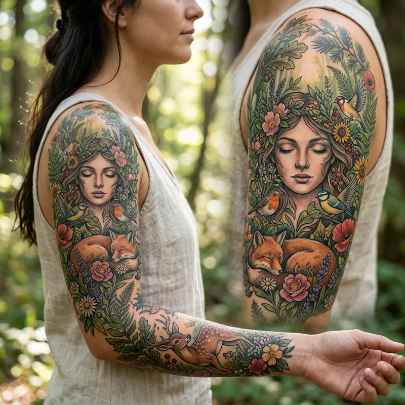 A nature-themed tattoo on the arm for a woman, featuring animals, flowers, and the visage of a woman enveloped in nature. The animals could be those commonly found in the forest like foxes, deer, or birds. Onto the mix of wildflowers, they could include roses, lavender, or sunflowers, surrounding the woman's face that emanates tranquility amid the verdant foliage.