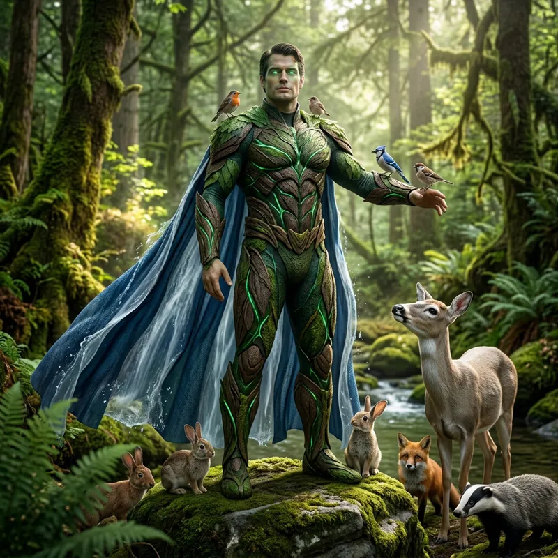 A powerful superhero, bestowed with abilities that transcend the normal domain of human capabilities, stands as a protector of nature. This figure is dressed in a suit of vibrant greens and earth tones, maintaining a layered, organic appearance resembling forest foliage with a cape reminiscent of a cascading waterfall. Their eyes emanate a soft glow, indicative of their strong connection to nature. They have an authoritative stance within a lush, flourishing forest, animals of various species gravitating towards them. Birds perch on their outstretched arms, while deer, rabbits, and other creatures stand near curiously. This scenery captures their stagnant role as the guardian of Earth's flora and fauna.