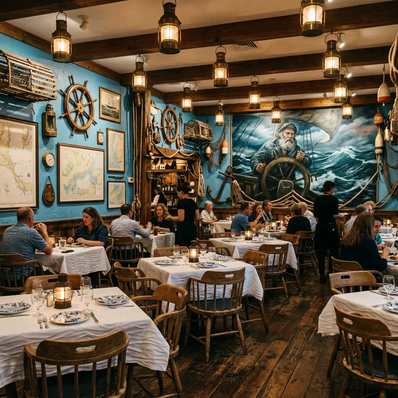 Visualize a restaurant interior with nautical theme. The main room filled with azure hues, antique steering wheels, and various ship maps adorning the walls. Tables are clad in white tablecloth mimicking waves, and chairs are of weathered oak. Decorative lobster traps, marine rope, and anchors evoke the ambiance of a seafarer's haven. Old brass lanterns hanging from the ceiling with a soft glow. On one wall, a mural of an ancient mariner guiding his ship through stormy seas makes the theme complete.