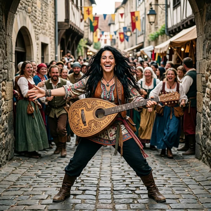 I need you to create an exuberant full-body human barrier with long black hair, brown eyes, holding a lute with engravings.