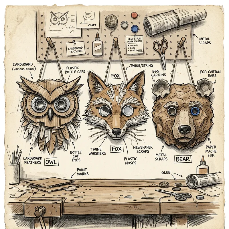 I need a sketch of masks made from cardboard representing animals with recyclable materials.