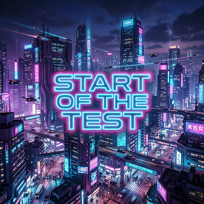 Visualize a large, glowing inscription that reads 'Start of the Test' situated at the center of the screen. Behind the inscription is an expansive cityscape lit up in neon lights. It's evening, with tall buildings casting long shadows amidst the vibrancy of the illuminated metropolis. The city is bathed in hues of purples, blues, and pinks, reminiscent of a classic cyberpunk aesthetic. The skyline is strewn with futuristic structures, digital billboards, and hovercars passing by, emphasizing the city's high-tech characterization and advanced technology.