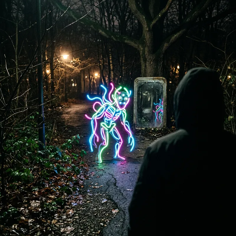 Neon Monster in a Dark Park at Night