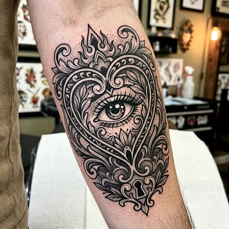 Neotraditional tattoo design featuring a heart, within which an eye is intricately embedded, done in crisp, bold, black lines