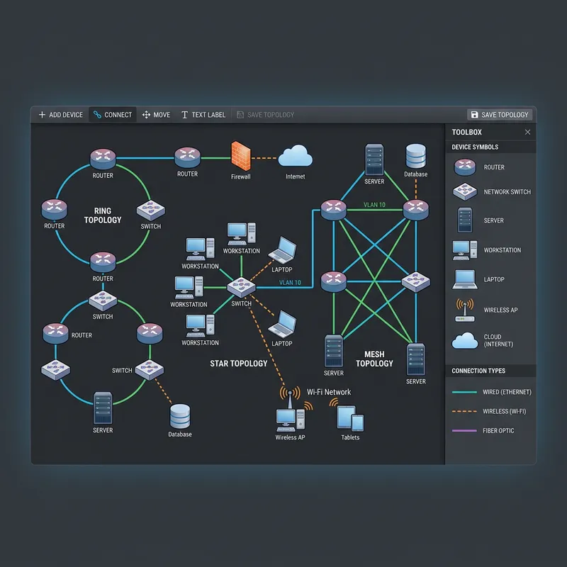 An illustration of a network topology tool, laid out on a dark grey background. This tool has a clear, easy-to-read interface, showcasing a variety of wired and wireless interconnections. Different types of symbols represent various network devices such as routers, switches, servers, and computers. There are colorful lines indicating the paths of the connections between these devices. Some of these connections form a ring topology, some form a star topology, and others form a mesh topology. To the side of the tool, there's a toolbox with all the symbols and their respective descriptive labels.