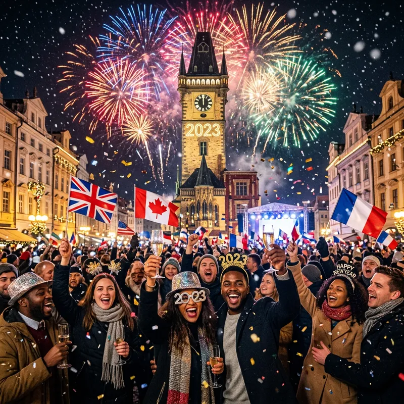 Picture this: It's New Year's Eve. A clock tower strikes midnight under a sky bursting with colorful fireworks. People of various descents and genders are cheering and raising their glasses for a toast. They are dressed in festive attire. Some are wearing 2023 novelty glasses, while others wave flags from different countries. The environment is filled with joy and a sense of renewal. Snow is falling gently, adding to the festive spirit.