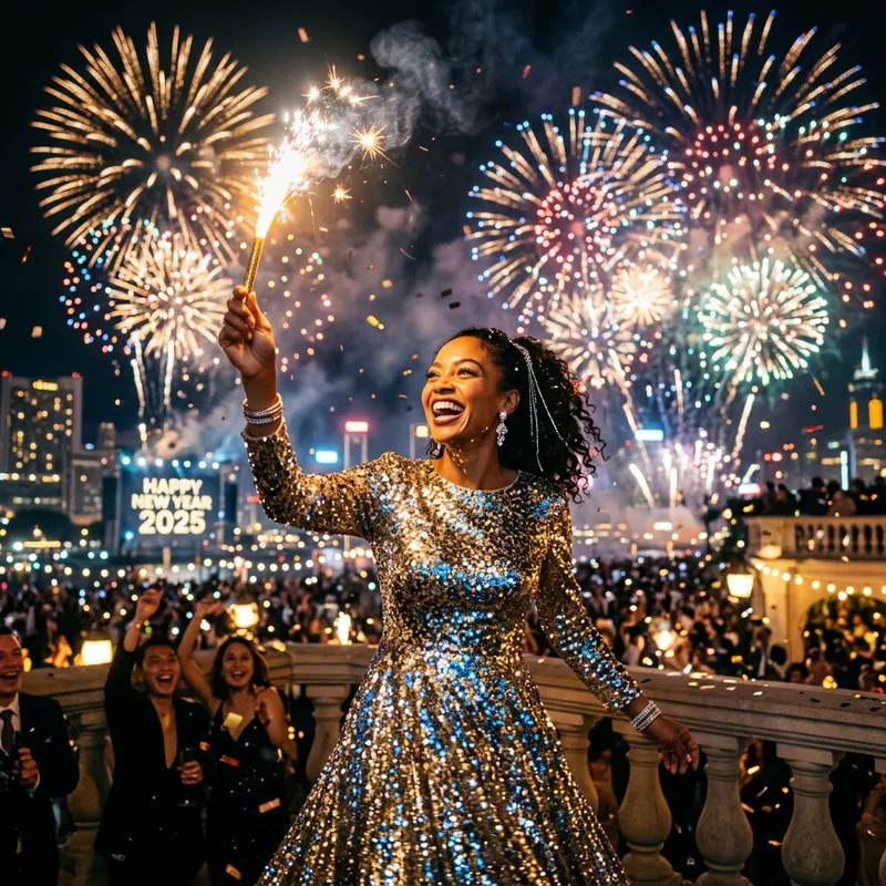 New Year's sparkler, person wearing shimmering sequined gown holding sparkler, festive environment with colorful fireworks in background, magical celebration pose, radiant joy expression, cinematic fireworks lighting.