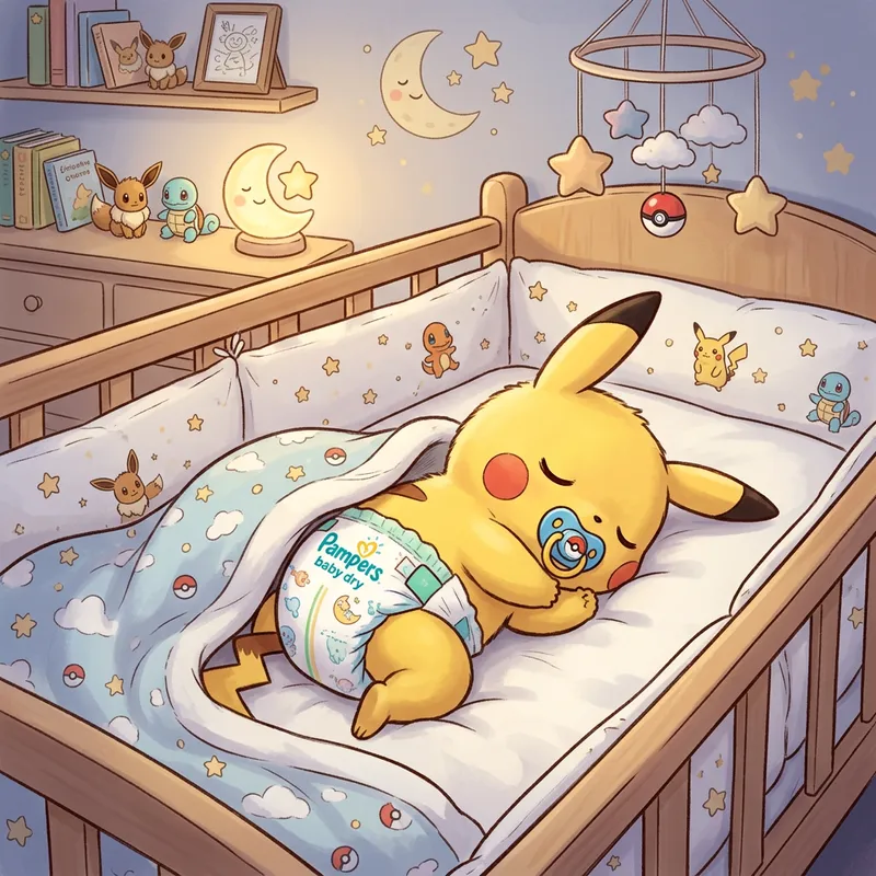 Cartoon image of a newborn Pikachu, aged 0 months, wearing Pampers Baby Dry diapers and a pacifier. The Pikachu is asleep in a crib.