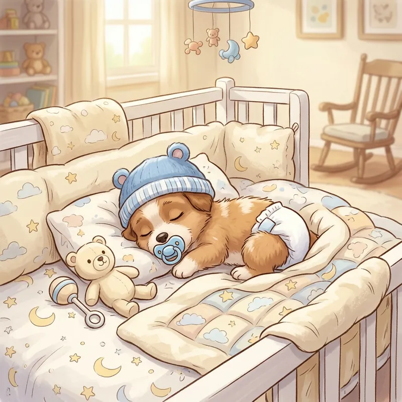 Create an image of a newborn puppy, approximately one month old, depicted as a cartoon animation. This puppy is sleeping peacefully in a crib, adorably wearing diapers, a baby hat, and sucking on a pacifier.