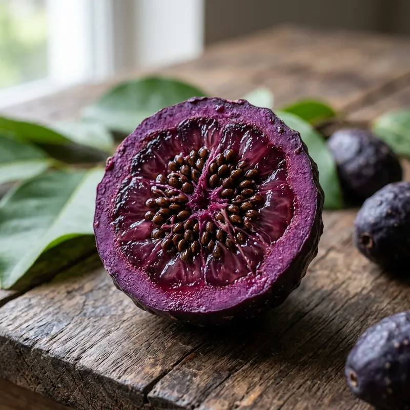 A close up image of an exotic, rare fruit known as 'Ngole'. This fruit is characterized by its rich purple color, hard exterior, and a bundle of seeds at its core. It is native to certain regions of South Asia and is known for its sour and tangy taste. The image should ideally capture the unique textures of the fruit's skin and its vibrant color.