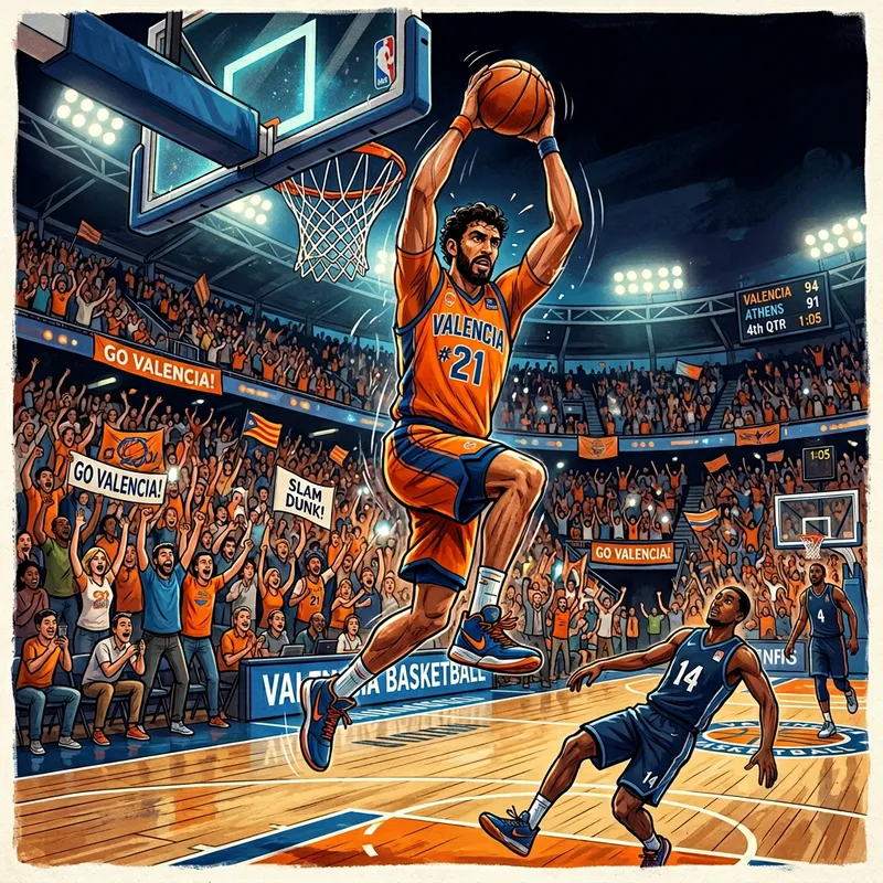 Illustration of a basketball game happening at night. The most athletic player, a tall man with Mediterranean descent wearing blue shorts and an orange jersey, is performing a spectacular slam dunk. The crowd in the stadium, filled with diverse people, is cheering excitedly.