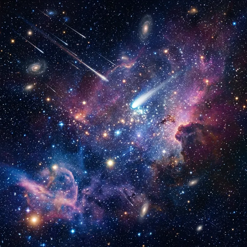 A cosmos of stars illuminating the night sky, casting an ethereal glow over the darkness. There is no particular object or character in focus, but rather an array of celestial bodies forming nebulous patterns. A faint shimmering light from distant galaxies adds a layer of mystique. There are streaks of astronomical phenomena — meteor showers, comets, and perhaps even a nebula — adding depth and complexity to the scene. The stars occasionally cluster, leaving brilliant patches amidst the vast expanse. With an abstract touch, this image evokes the infinite and boundless universe.