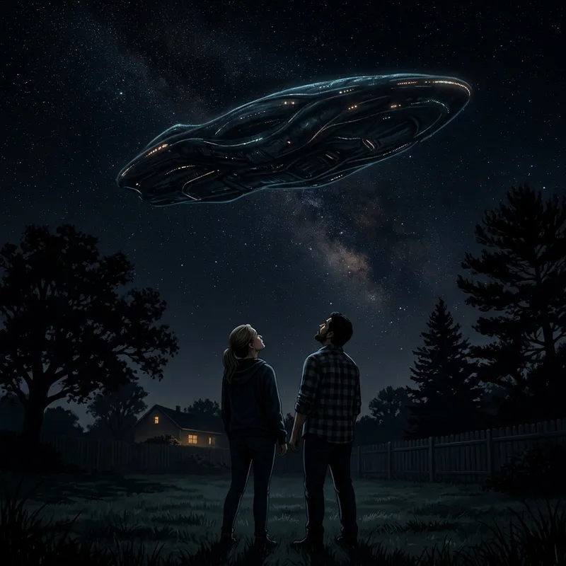 Imagine the perspective of a Caucasian woman and a Hispanic man standing in a semi-rural backyard in Indiana, looking straight up into the night sky. Floating overhead is a slightly elongated spaceship with subtle lighting around its exterior. It's difficult to discern the intricate structures on the spaceship's surface as it mirrors the profound depths of a nocturnal ocean. The color scheme of this illustration is minimalistic; predominantly dark hues with the exception of faint lights from the spaceship.