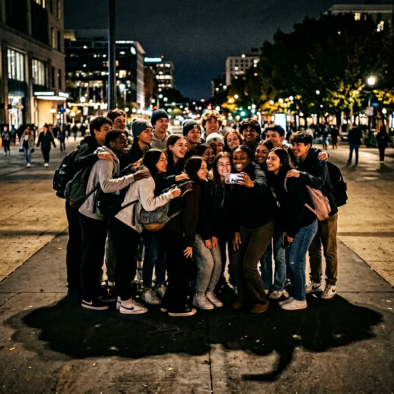 A photo-realistic image of nighttime showing a group of 20 diverse teenagers, each silhouette defined by the softened glow of ambient light. Their shadows merge to form a cohesive image as they huddle together, a testament to unity and camaraderie. The teens, varied in gender and racial identity, are capturing a cherished moment of their teenage years to remember.