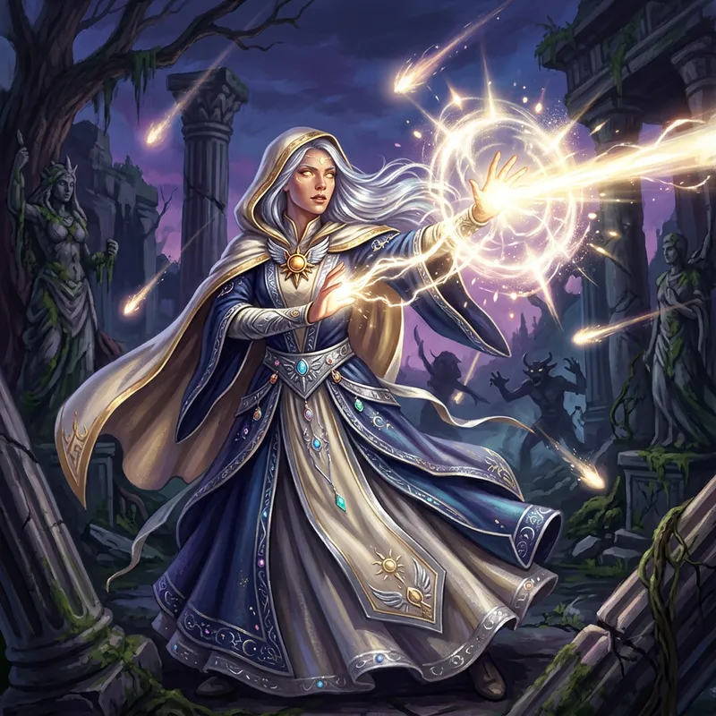 A character resembling a classical fantasy Sorceress in the realm of a mystical role-playing game, exemplifying the Divine Soul Sorcerer class of the Aasimar race. She can be similar to a female protagonist from a well-known fantasy book series, drawn with vibrant and mystical hues to capture the spirit of extraordinary worlds. Capture the character in an intense battle scene, casting radiant spells with powerful facial expressions. The style should be in line with a digital painting, with meticulous details and glowing effects, reminiscent of traditional fantasy novels and artwork.
