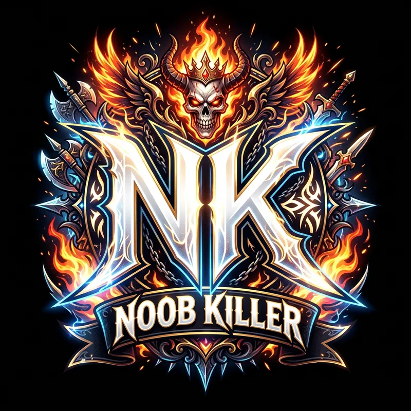 Please generate a 2D game logo with the acronym 'NK' standing for 'Noob Killer'. The background of the logo should be in stark contrast with the letters, with black being the preferred color. The letters should be in white to distinctly stand out against the background. Furthermore, the design should be ostentatious and flamboyant.