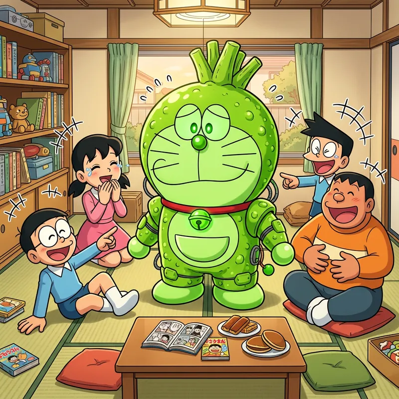 Nobita and his friends couldn't help but burst out laughing at the sight of Doraemon, who looked like a giant wasabi-flavored robot.