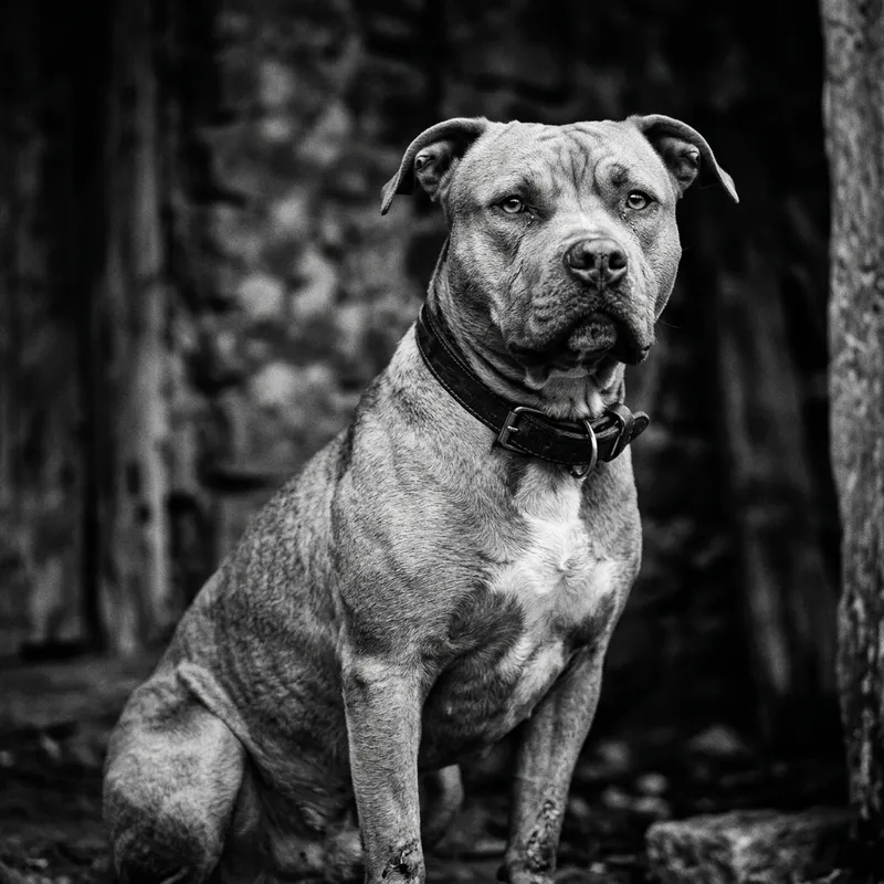 A strong and noble pit bull displaying a brown and beige coat, captured in a high contrast black and white themed artwork. This dynamic pose emphasizes the intricate details and textures of the fur, mimicking the style of animal portraiture captured with a professional level camera with specs including aperture set to f/2.8 and equipped with a 50mm lens. The overall composition is intended to mimic the depth and clarity of images captured with a Canon EOS 5D Mark IV, without directly utilizing the camera.