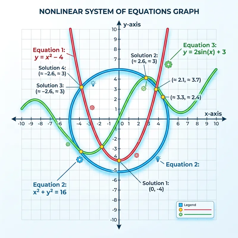 Illustration of a nonlinear systems of equations graph. It should comprise of multiple curvilinear lines intersecting each other at different points, signifying the solutions to the equations. The graph should be depicted on a 2D plane with accurately labeled axes and distinct indicators for each equation's curve. Include points of intersection marked clearly to show the solutions to the system.