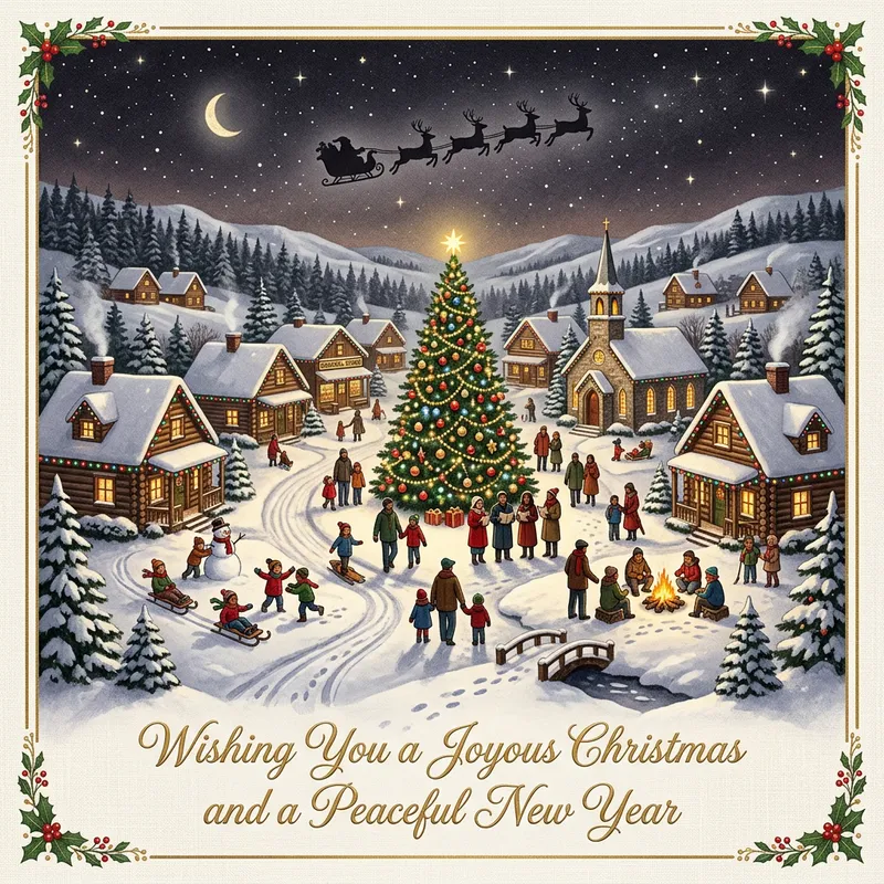 Imagine a traditional Christmas card with a nostalgic touch. The front of the card maintains a timeless concept; a peaceful, snow-covered village at night with little log-cabin style houses. Multicolored lights decorate the eaves of the buildings. In the distance, a tall, well-decorated Christmas tree stands majestically in the village square. Villagers, men, women, and children of different descents such as Caucasian, Hispanic, and Middle-Eastern are clad in warm winter clothes, participating in various winter activities. The dark, starry sky above is draped with the silhouettes of Santa and his reindeer, accompanied by a heartwarming holiday message written in elegant cursive script on the lower part of the card.
