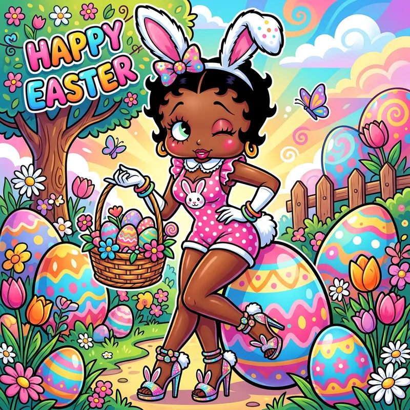 Nubian model as Betty Boop styled playfully as an Easter Bunny in high heels, in the style of vibrant pop art with exaggerated cartoonish features, striking a flirty pose with a playful expression, digital painting with bold colors and smooth gradients, whimsical and colorful.