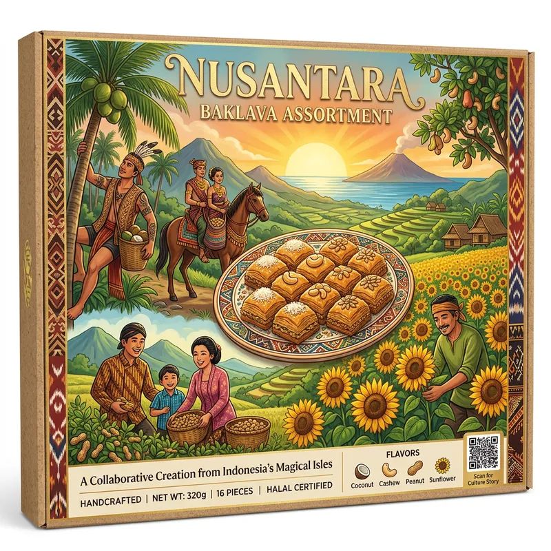 Illustrate a design for the package of a Nusantara-inspired Baklava Assortment. The package should give a vibe of the magical land where the sun embraced the earth with warmth, an orchard nestled between vibrant coconut groves and rolling hills. Display the cultural elements of the Dayak people of Kalimantan, Sumba, Javanese of Tuban, and Sundanese of Bandung all collaborating to craft the delicious assortment. Depict the representatives of each culture engrossed in their specific tasks, the Dayak harvesting coconuts, the Sumba couple on majestic horses collecting cashew nuts, the jovial Javanese family gathering peanuts, and the Sundanese farmer surrounded by sunflower fields. Illustrate the finished baklava in the middle, beautifully adorned with symbols of each culture. Finally, incorporate a user-friendly UI and intuitive UX for this imagined Nusantara-inspired baklava package.