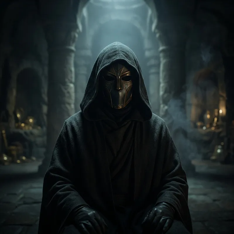 Create an image depicting an avatar for a member of a secret council. This character could be cloaked in mystery with elements of intrigue, such as a mask obscuring their face and a hood covering their head. In the background, hints of a secret meeting location could be subtly suggested, like shadows of tall, ancient-looking columns and the gleam of hidden treasures. The whole scene set under a soft, eerie light. Note: this character should not be identifiable as any specific real or fictional person.