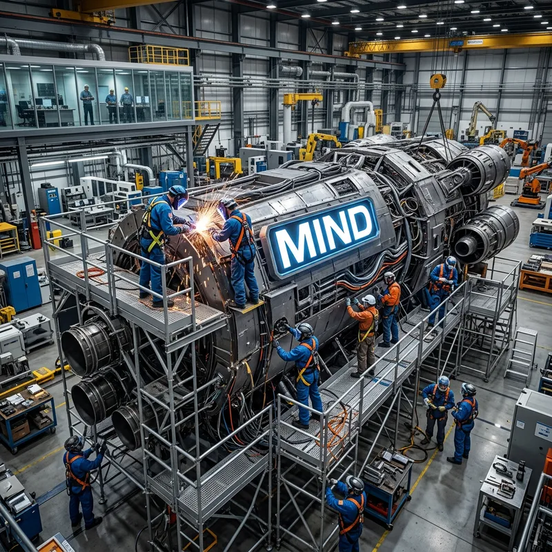 Workers in a futuristic factory building a modern giant device that will travel to space. The giant device has a large sign that says 'MIND'.