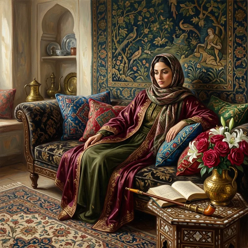 An indoor scene in the style of classical European painting. A fully clothed adult woman of Middle-Eastern descent in a pose suggesting relaxation. She's on an ornate sofa with multiple plush, vibrant pillows. A colorful tapestry hangs behind as a backdrop. The room is adorned with beautiful objects: a golden vase with blooming flowers, a delicately woven carpet spread beneath, and an open book along with a long-stemmed ornamented pipe on a low, decorative table.