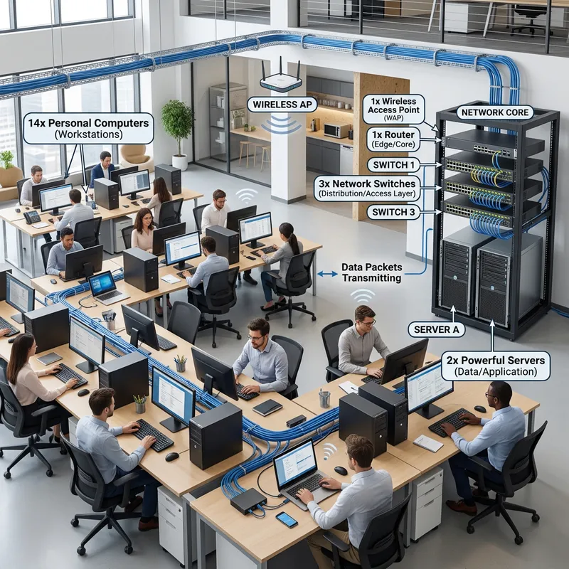 Generate a detailed image showing a computer network infrastructure set up in an office environment. It should incorporate a minimum of ten personal computers distributed in an efficient manner. Three network switches should be depicted, facilitating the transmission of data packets among the devices in the network. Also include a single router, which serves to route data packets to their respective destinations within the network. One access point, enabling wireless devices to connect to the network, should be shown. Lastly, two powerful servers that store, send, and process data should be incorporated into the scene.