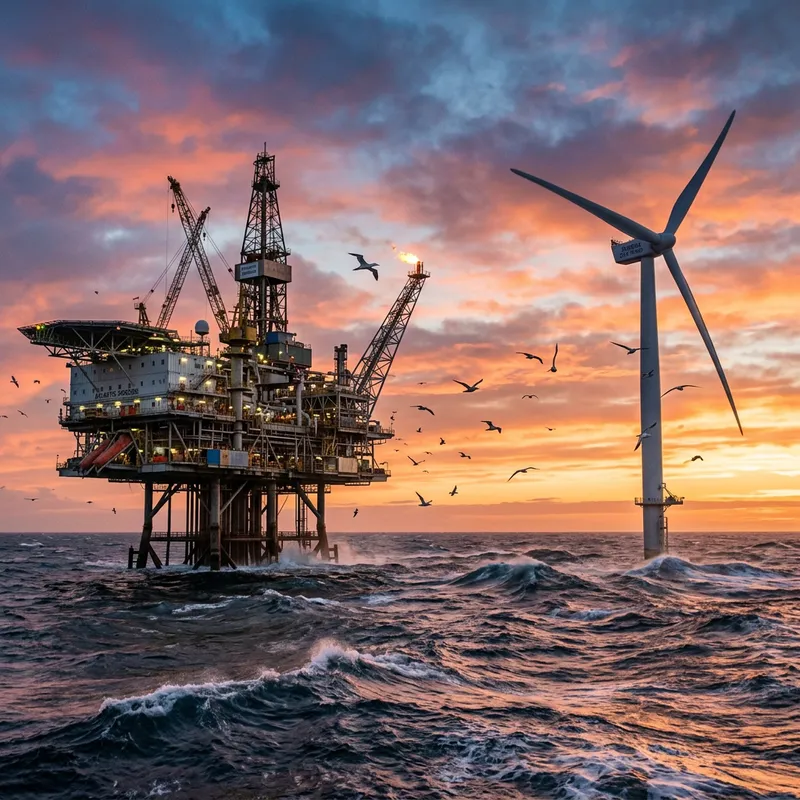 An offshore oil drilling platform stands tall amidst the churning ocean waves. Not too far from it, a modern wind turbine spirals upwards towards the sky, its blades lazily spinning in the sea breeze. The scene is a juxtaposition of traditional fuel harvesting methods and renewable energy sources. Seabirds fly around, casting their fleeting shadows on the metallic surfaces of both structures. The setting sun paints the sky with hues of orange and pink, reflecting glassy colors onto the undulating sea surface.