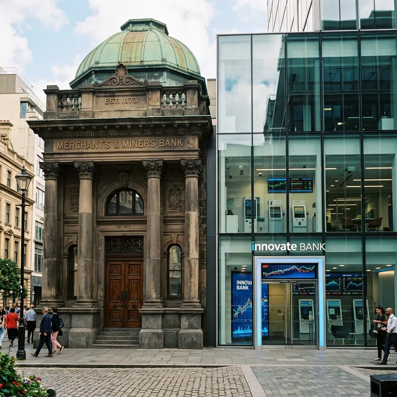 Imagine a comparison between two different banks. One bank, styled in an old-fashioned manner representative of 19th century architecture, with large stone pillars, a green copper roof, and a big wooden door. The building's stern appearance reflects the traditional banking principles of stability and trust. On the other hand, there's a modern bank with sleek glass walls, high-tech security systems visible through the glass, and an inviting front door featuring interactive displays. This bank exudes the atmosphere of innovation and ease. These contrasting banks stand next to each other, bridging the gap between old and new economic eras.