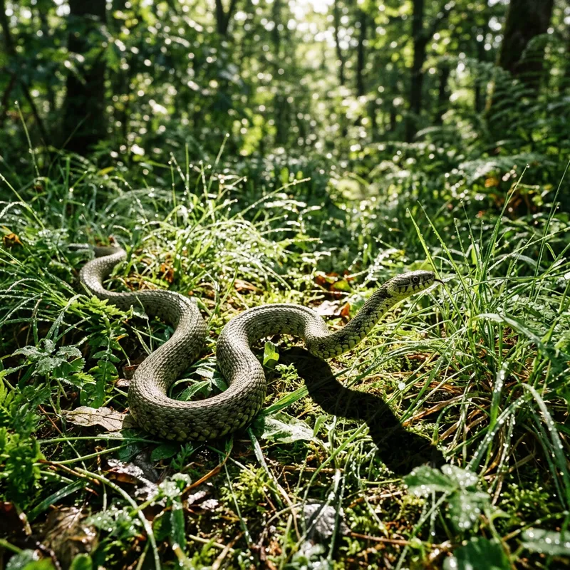 Visualize a scene in nature with a snake slithering through it. It's a scaly reptile, with its distinctive bodily texture and patterns vividly visible. The snake is olive green in color, blending in with the surrounding foliage. The environment around the snake is lush with various types of vegetation. Sunlight pierces through the canopy, creating a mesmerizing diffraction pattern on the ground, and casting a dramatic shadow of the snake. The beads of dew on the grass sparkle like small jewels adding an ethereal quality to the scene. It's a serene yet suspenseful moment in the wild.