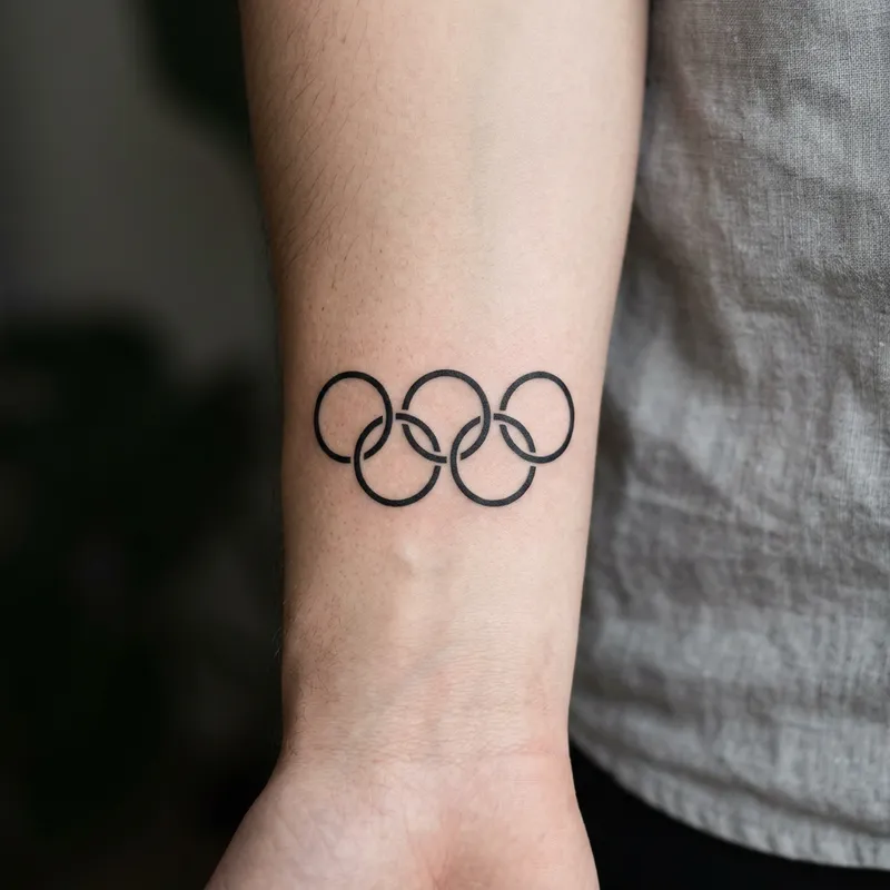 An Olympic style minimal tattoo featuring the iconic five interlocking rings. The rings are presented in a simple, stark design with no additional embellishment or color, capturing the essence of minimalism. The arrangement is precise and well balanced, each circle evenly proportioned and the interconnecting lines clean and seamless to create an aesthetic that is simple yet striking. Positioned on a muted background to further enhance the minimalist appeal.