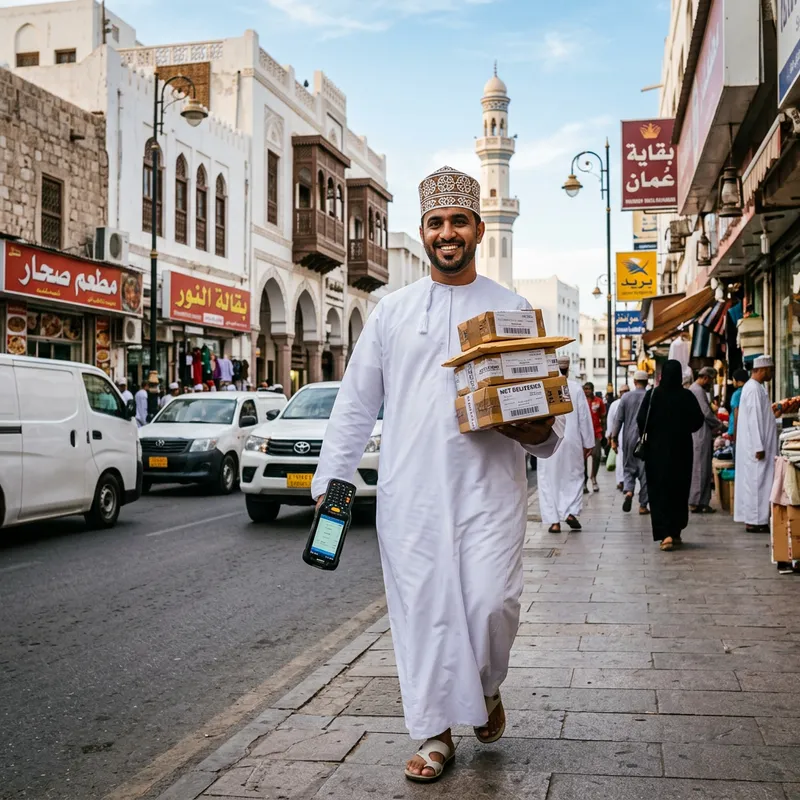 An Omani man, dressed in traditional Omani attire consisting of a dishdasha (a long, ankle-length white robe) and a kuma (a cap), is in the middle of delivering packages in a bustling city street. He is holding a digital checklist in one hand and in the other, a stack of small, neatly packed parcels. His face carries a warm smile. Cultural elements from Oman, like its distinctive architecture, can be seen in the background.
