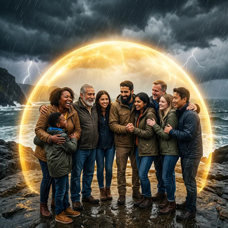 An image visualizing the concept 'Once Saved Always Saved'. A diverse group of individuals huddled together, displaying expressions of relief and security. They represent people from various descents such as Caucasian, Hispanic, Black, Middle-Eastern, South Asian, and White. The background showcases a heavy storm which they are no longer part of. Instead, they are under a golden protective shield symbolizing their safety. This shield is bright and shines in stark contrast to the turbulent weather around it, signifying a place of permanence and assurance amidst the chaos of the storm.
