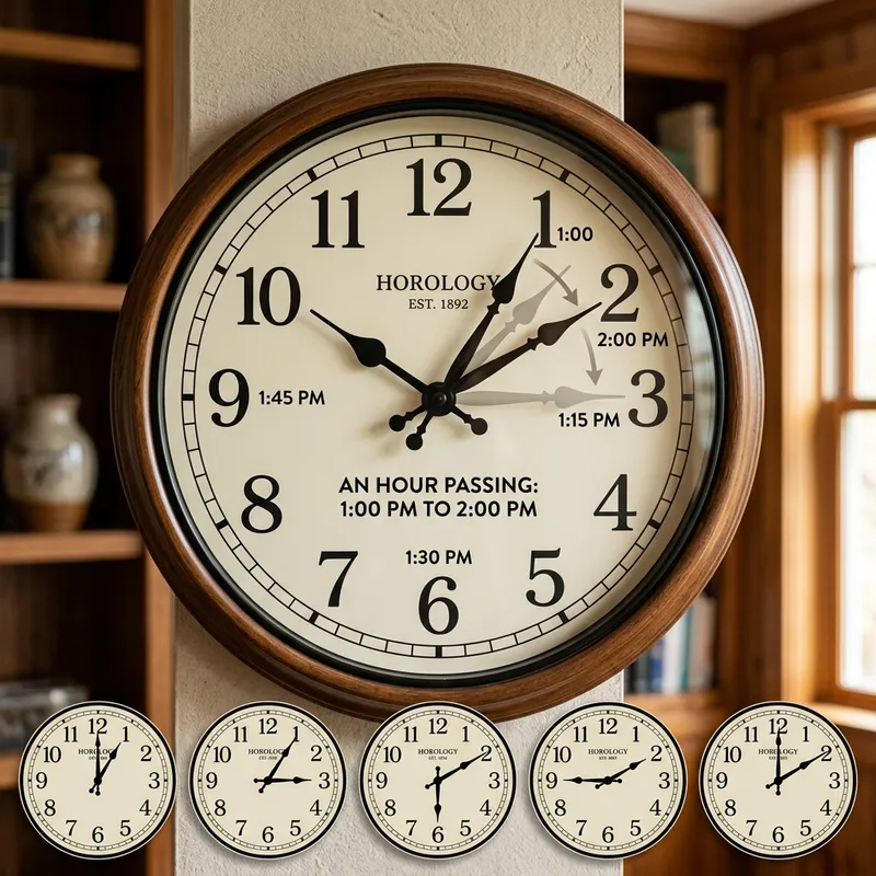 Visual representation of an hour passing on a traditional analog clock, highlighting the movement of the hour hand around the face from one number to next.