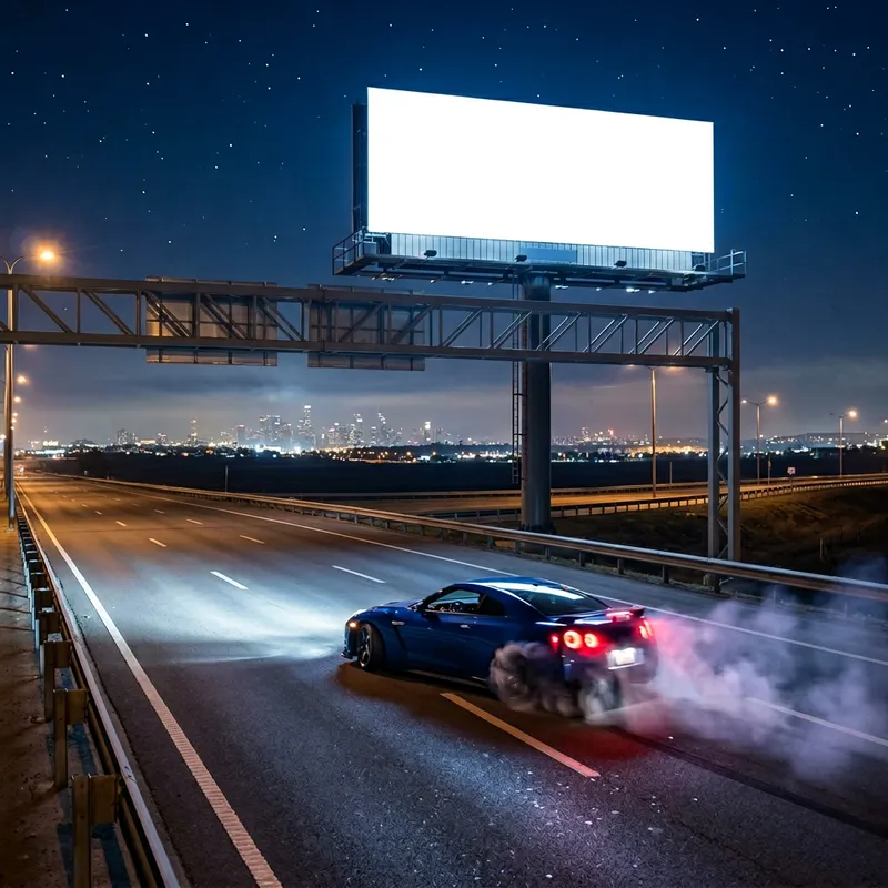 Imagine a scene set at nighttime where a solitary sports car is engaging in a daring drift maneuver on a one-way highway. The roads are perfectly empty, with no other vehicles in sight. Close to the center of the highway, there is an enormous billboard standing tall. Intriguingly, this billboard is completely empty; it holds no advertisements or content within its frame. The background of the scene contributes to a majestic ambiance, perhaps with dark, star-studded skies, and highlights from the cityscape providing a low ambient glow.