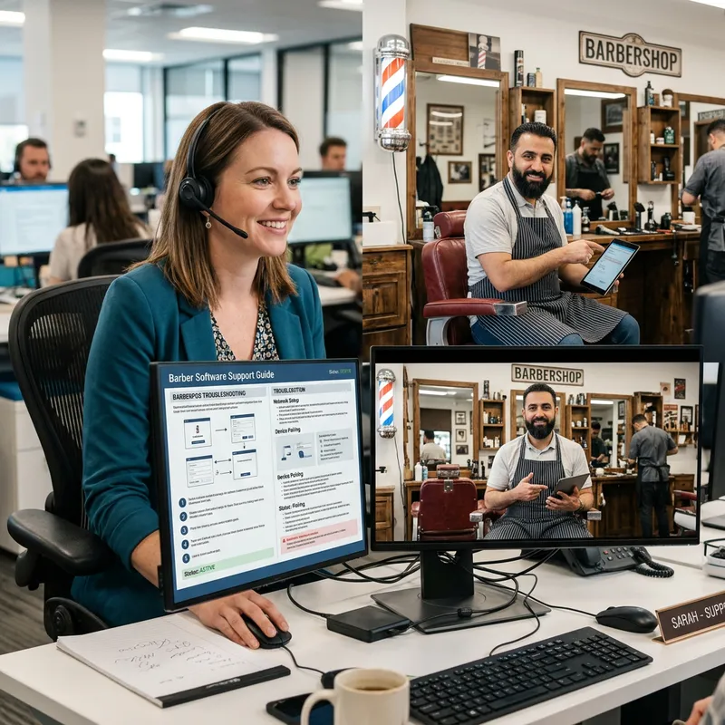 An empathetic Caucasian female customer service representative, seated on an office chair with a headset on her head, helping out a Middle-Eastern male barber on a video call. The barber is shown in a traditional barber shop environment, with a barber's pole, antique barber's chair and a mirror behind him. The support team's screen is split between the video call window and a digital help guide to assist the barber with the issue. The representative's computer monitor should be given prominence, illustrating that this is an online support service interaction.