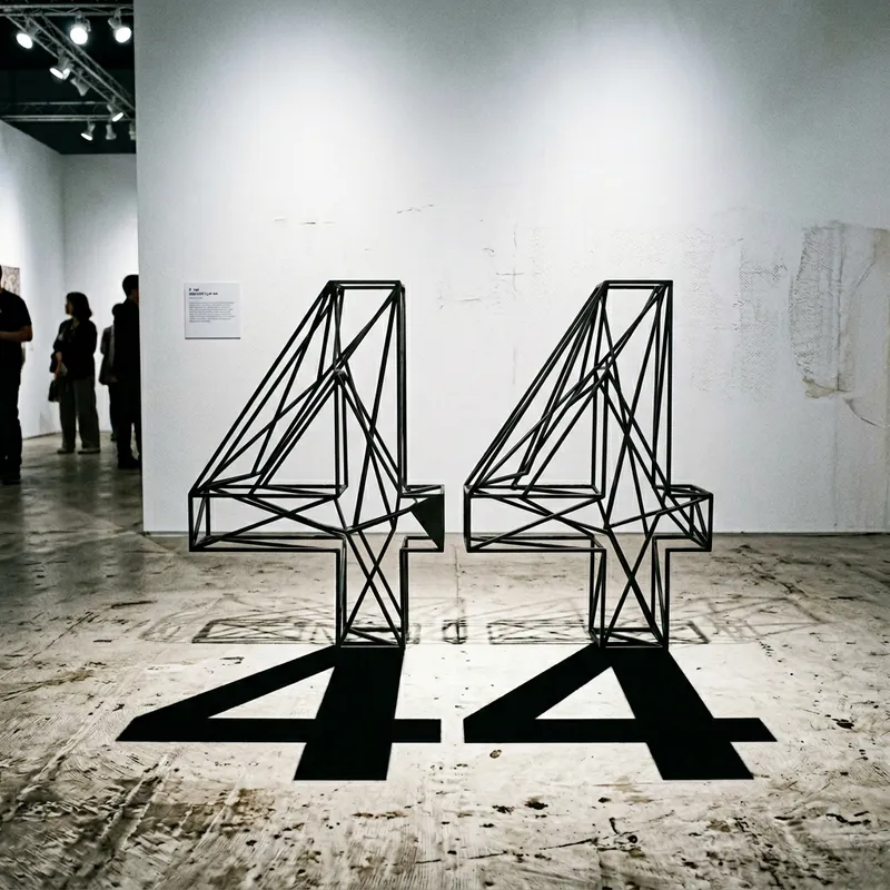 Rendering of a photo depicting two chairs for an optical illusion. Positioned in such a way, they cast a shadow on the floor, which forms the number 44. The scene implies bright overhead lighting to emphasize the shadows.