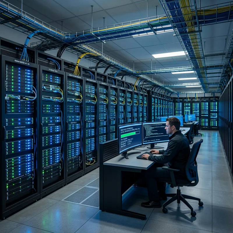 Visualize an abstract computational concept. Picture this: An environment dedicated to optimizing RMAN backups. Numerous computers and servers are meticulously arranged in a high-tech server room. Bright LED lights signify the facilitation of data, as the computers systematically process and expedite the reduction of redundant copies of data to create efficient, optimised RMAN backups. On some of the monitors, you can see coding scripts and progress bars, symbolizing the ongoing backup processes. Everything is efficient, tidy, and profoundly digital.