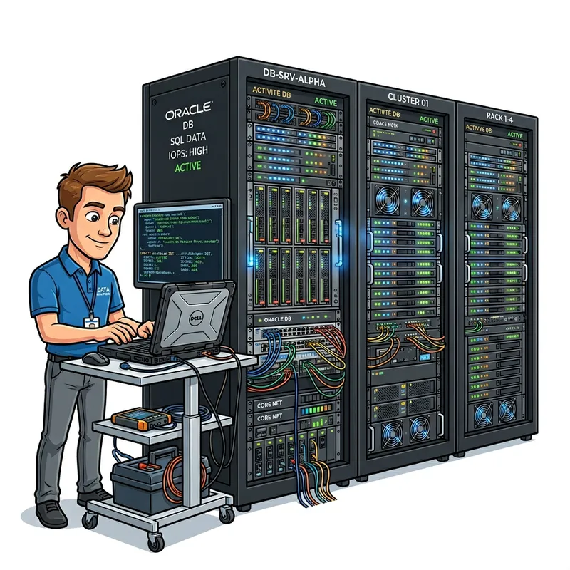An image showcasing a large database server, situated in the middle of the scene, is humming with power. To its sides, a Caucasian male cartoon figure is seen diligently working on a laptop, making adjustments to the database system. The entire scene is enveloped in the crisp cleanliness of a white background.