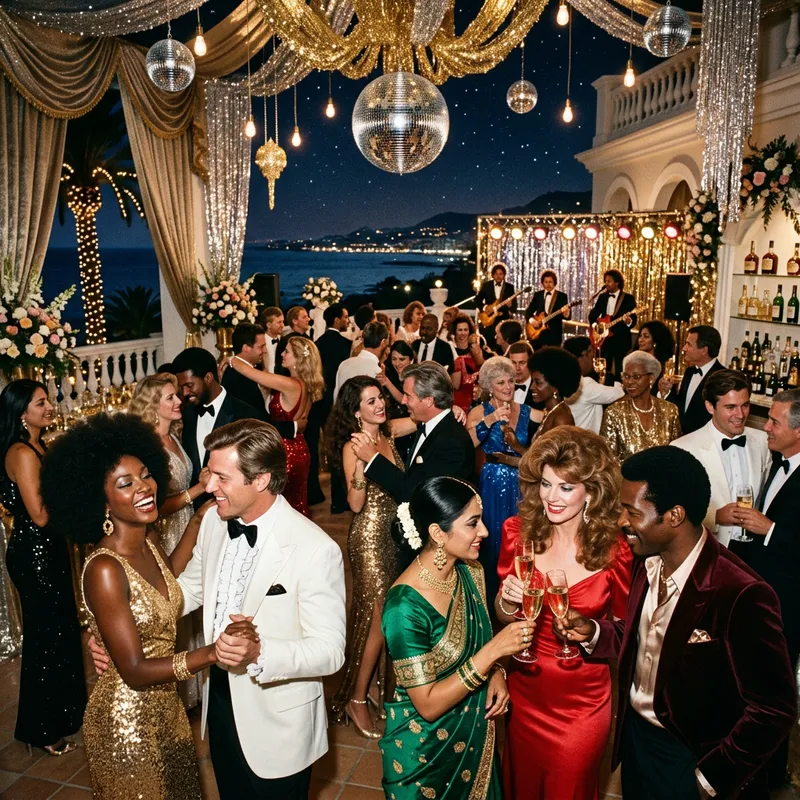 A grand fiesta taking place in Marbella, adorned with luxurious decorations. The scenery sparkles with gold and silver embellishments, taking us back to the aesthetic of the 70's-80's era. The partygoers consist of a mixture of people including Caucasian men and women, Black men and women, South Asian men and women, all dressed in glamorous vintage attire. Among the crowd, an array of actions occur simultaneously; conversation, laughter, dancing and the clinking of fancy glassware. The atmosphere oozes opulence and fun, encapsulating the essence of a high-society party during the 70s and 80s.
