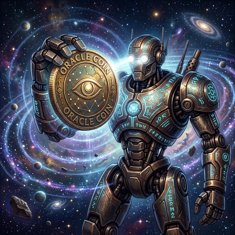 A massive metallic robot, with intricate designs etched into its surface, is lifting a large coin that has the inscription 'ORACLE COIN'. The robot stands against the backdrop of a starry universe, its glowing eyes illuminating the splendid coin. The echo of this grand announcement reverberates across celestial bodies, letting every corner of the universe know about the existence of this coin.