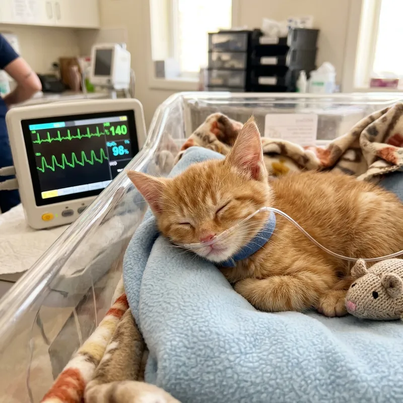 An adorable orange furred kitten resting in a cozy hospital bed, outfitted with medical equipment. The small creature has benign features and a serene look, attached to an oxygen tube for adequate breathing. Aside from this, a heart monitor is subtly present adjacent to the bed, its screen displaying rhythmic waves, indicating the kitty's strong, steady heartbeat. The atmosphere is calm, promoting a sense of tranquility and hope, as the tender care taken by unseen veterinary professionals manifests in the relaxed positioning of the kitten.