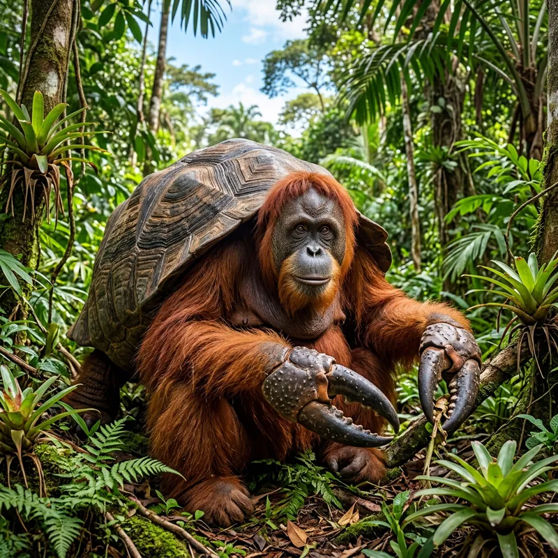 Imagine a creature that is a fusion of an orangutan with monstrous features. This beast has an expansive shell covering its body like a natural armor, resembling that of a tortoise but on a larger scale. Instead of the usual primate hands, it has enormous pincers, similar to a crab. Despite its ferocious appearance, it has the gentle inquisitive eyes consistent with its orangutan ancestry. The surrounding area is a dense tropical rainforest, with the creature sitting among the lush green vegetation, under a bright and clear sky.