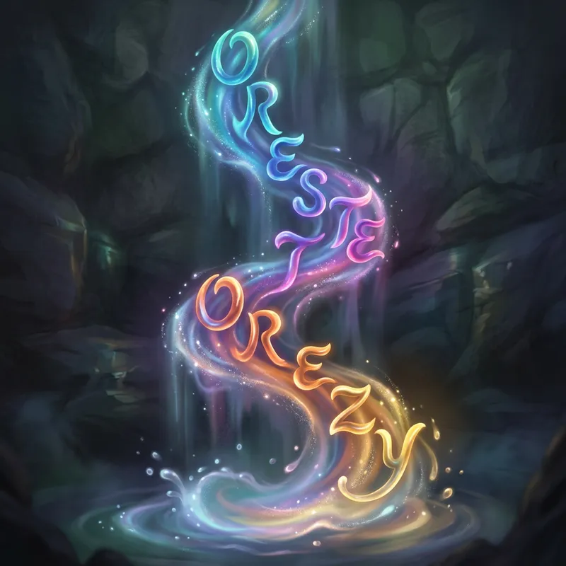 An abstract visualization of the name 'Oreste Orezy'. Think of the letters cascading down like a waterfall, shifting and undulating. The letters 'O', 'R', 'E', 'S', 'T', 'E', 'O', 'R', 'E', 'Z', 'Y', are all distinct, each with a unique shape and character. They're a mix of cool and warm colors, blending seamlessly into one another. The backdrop is a contrasting, muted palette that allows the colors of the letters to pop. There's a faint glimmer around the letters, giving them an ethereal glow. This scene is tranquil yet dynamic, much like a waterfall itself.